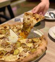 饼皮吃起来是偏薄的口感,吃一口时会有满满的料,培根马铃薯都很香很不错吃,培根不会到太肥满加分的,再搭上温泉蛋,软嫩的蛋白以及溢出的蛋黄就是绝配,还有清爽脆口的洋葱,也让整个味道不会过於单一(毕竟培根&马铃薯属於吃多会腻的食物)
