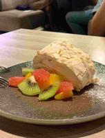 蛋糕卷的外皮脆脆的,里面吃起来相当松软也很甜,是很特别的口感,有点像棉花糖!里面有莱姆酱,酸味有稍微中和掉了整体的甜味,但还是非常甜到有点锁喉,水果的话算满新鲜的