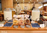 供餐时间07:30-09:30早餐一样是和社食堂内,一早就准备了中式清粥小菜、西式面包、培根等,还有特别的明太子山药,种类非常丰富,且有些食物也是平时比较少见。