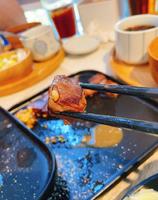 位在草屯人气超旺的 #弎食鉄板料理 早就存在苏菲口袋名单已久,这次趁假日到南投踏青一定要来朝圣一下罗!-樱桃鸭腿带皮肉质超Q弹,外皮煎的恰恰脆口好赞,松阪猪煎成金黄色泽撒上蒜片还有自制葱油搭着吃也很棒,嫩肩安格斯牛排建议五分熟,真的嘟嘟好,软嫩带点细筋有嚼劲,搭上蒜片玫瑰盐都很不错?,整体的配菜,茶碗蒸、沙拉用料都很丰富美味,完全好评不断,超值的在回访的铁板烧,大推???