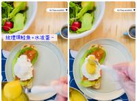 但要放上鲑鱼时,苯手把蛋白分开了一些,