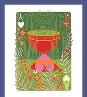 ▲红心A(圣杯一)的牌卡图案是一个正位的圣杯,也代表着水在杯内、未被倾倒,同时牌卡的图案下方有一只小鱼,鱼代表的是「创意」,因此抽到这张牌卡的人,代表能展开一个充满创意与创新的事情、机会等,或者也说明这个人本身很有创意、想法。若是逆位,由於水跟「情绪」相关,圣杯内的水都倾倒、溢出了,也代表有可能太过情绪化、情绪起伏较大,也可能是期待会落空、感情付出会流失等含意。