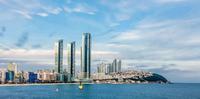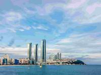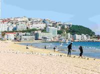 海云台海水浴场,海岸线全长约1.5公里,是釜山最着名的海滩之一,弧形的海岸线与白沙沙滩旁聚集了新颖的摩天大楼与商店街,放松的同时还能拥有便利的生活机能,与澳洲的黄金海岸有几分神似。